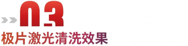 正負極片由三層組成,敷料-箔材-敷料,清洗掉敷料露出箔材,正極清洗單麵厚度80μm左右,負極70μm。方案中,激光功率、填充間距、脈衝(chong) 寬度、清洗遍數與(yu) 振鏡掃描速度直接決(jue) 定著清洗的效率和效果。方案通過多輪測試,不斷調整工藝參數,最終實現了客戶清洗的工藝要求。