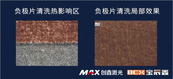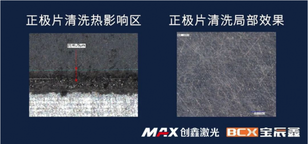 寶辰鑫激光清洗應用解決(jue) 方案具備綠色環保、潔淨度高、無耗材、成本低等優(you) 勢,清洗效果好,(清洗區域殘留物麵積<1%,清洗潔淨度>99%);清洗效率高,(負極極片清洗效率0.75s,正極極片清洗效率1.4s)。電池極片經過激光清洗後,表麵無劃痕、無毛刺,動力電池的安全性能及使用壽命得到有效保障。