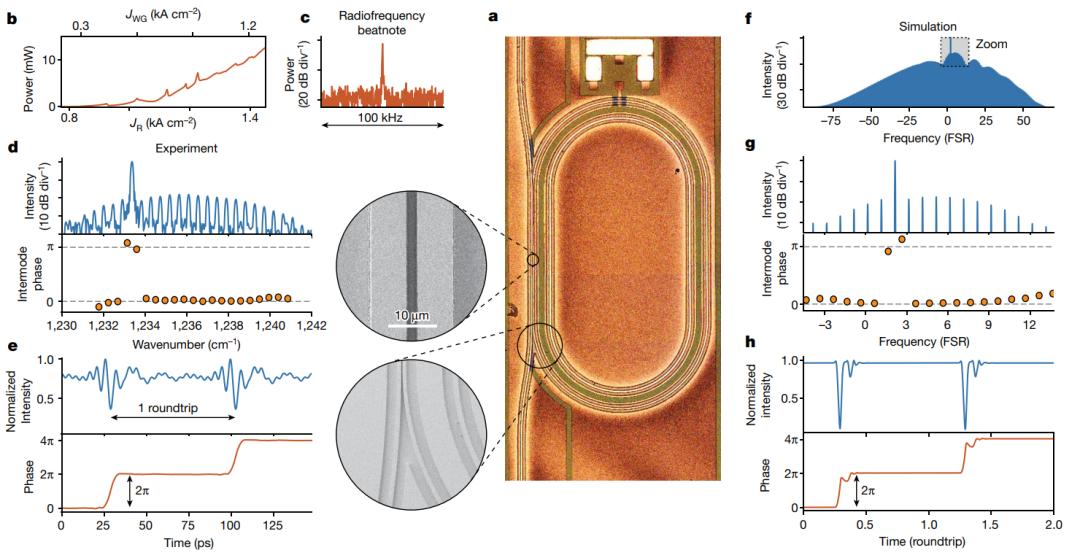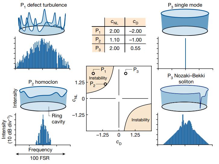 近日,奧地利 維也納工業(ye) 大學(TU Wien) Nikola Opačak,Benedikt Schwarz等,在Nature上發文,在環形半導體(ti) 激光器中融合了這兩(liang) 種技術,並展示了自由運行孤子形成的範例,稱為(wei) Nozaki–Bekki孤子。這些耗散波形出現在一族傳(chuan) 播的局部暗脈衝(chong) ,並在複雜金茲(zi) 堡-朗道方程中是已知。