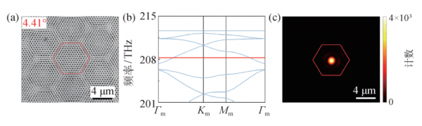 圖1 魔角納米激光 (a)將兩(liang) 套扭轉的光子晶體(ti) 晶格置於(yu) 同一層半導體(ti) 材料中形成的單層轉角莫爾超晶格的電子顯微鏡照片。兩(liang) 套光子晶體(ti) 晶格間的相對轉角為(wei) 4.41°。紅色六邊形是莫爾超晶格的一個(ge) 原胞。局域在每個(ge) 原胞中的莫爾平帶波函數均可被用來構建莫爾納米激光;(b)通過三維全波模擬得到的(a)圖中莫爾超晶格的能帶結構。紅色的能帶為(wei) 莫爾光學平帶,其在實空間對應著局域化的波函數;(c)利用局域在單個(ge) 莫爾原胞中的平帶波函數實現的魔角納米激光近場激射圖案