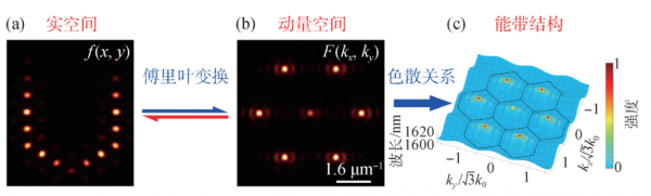 一般而言,當把相同的納米激光排布成陣列時,由於(yu) 納米激光諧振腔之間的相互耦合,其簡並的頻率會(hui) 發生劈裂。但由魔角納米激光排布構成的莫爾超晶格中,各納米激光的頻率均對應著莫爾光學平帶,具有頻率簡並的特性。最近,我們(men) 利用這一特性實現了莫爾納米激光陣列的相位鎖定和控製,使其能夠生成任意形狀的陣列化相幹激射[16]。納米激光陣列實空間和動量空間的電場強度分布由傅裏葉變換相互聯係,動量空間分布通過能帶結構對應出頻率分布,莫爾平帶保證了頻率的簡並性,這種簡並特性使得任意形狀納米激光陣列的相幹激射成為(wei) 可能(圖2)。
