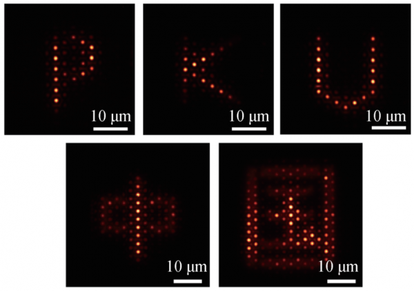 圖3 莫爾納米激光陣列以“P”、“K”、“U”和“中”、“國”圖形生成的陣列化相幹激射。由於(yu) 莫爾平帶的本征能量簡並特性,任意形狀的莫爾納米激光陣列均能夠通過自發相位鎖定產(chan) 生相幹激射