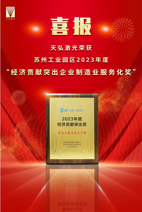 2月29日,蘇州工業(ye) 園區優(you) 化營商環境暨作風效能建設大會(hui) 在現代大廈召開。為(wei) 推動以企業(ye) 為(wei) 主體(ti) 的產(chan) 業(ye) 創新、科技創新,加快建設開放創新的世界一流高科技園區,對園區2023年度經濟貢獻突出企業(ye) 予以表彰,蘇州工業(ye) 園區領導向受表彰企業(ye) 頒發“2023蘇州工業(ye) 園區經濟貢獻突出企業(ye) ”獎牌,對企業(ye) 高質量快速發展給予高度肯定。天弘激光榮獲“蘇州工業(ye) 園區2023年度經濟貢獻突出企業(ye) 製造業(ye) 服務化三十強獎”。