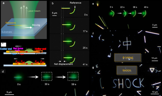 捕獲(Trapping)特性是激光操控技術的核心,因為(wei) 它可以通過光斑位置來掌握粒子的動向,實現任意的運動控製,而不僅(jin) 僅(jin) 止步於(yu) 缺乏控製的致動(Actuation)。金納米線在532nm納秒脈衝(chong) 的高斯型光斑作用下,會(hui) 向光斑內(nei) 部移動,直到納米線的中心與(yu) 光斑中心一致,這是一個(ge) 典型的捕獲過程。研究人員通過理論分析,找到了光熱衝(chong) 擊驅動力的物理來源,因表達式中包含溫度梯度,因此該力被稱為(wei) 光熱梯度力。當移動光斑時,光熱梯度力分布平衡被打破,納米線重新向光斑中心移動,一直重複該過程,納米線就會(hui) 隨著光斑一直軸向移動。另外對被捕獲在光斑中央的納米線,提高激光功率將會(hui) 使納米線兩(liang) 端受到更大光熱梯度力擠壓而側(ce) 向彎曲,從(cong) 而實現側(ce) 向移動。這樣就實現了納米線在二維平麵上的任意運動。如下圖展示了研究團隊將多根納米線拚成漢字“衝(chong) ”和英文單詞“SHOCK”的圖案。