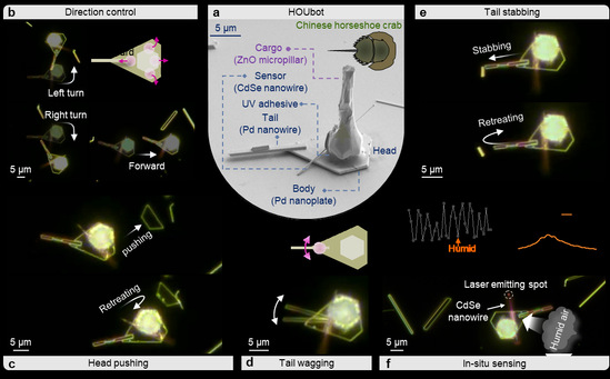 研究人員又利用金屬鈀納米片為(wei) 底盤搭建了一個(ge) 結構更複雜、功能更多樣的納米機器人,因形似中華鱟,被稱為(wei) HOUbot(圖4a及視頻)。該機器人能像汽車一樣自由移動 ,並做出頭部推動、獨立尾部搖擺和戳刺等更高自由度和精細的動作。機器人身上搭載半導體(ti) 納米線可用於(yu) 原位濕度傳(chuan) 感。由於(yu) 其相對較大的表麵,該機器人具有很強負載能力,理論有效載荷可以達到毫克量級(相當於(yu) 一隻螞蟻的質量)。通過采用現有的宏觀機械設計來裝備更多的機載組件或貨物,HOUbot可以像宏觀機器人一樣工作,是世界首個(ge) 利用傳(chuan) 統機械手段實現的可執行具體(ti) 任務的納米機器人。