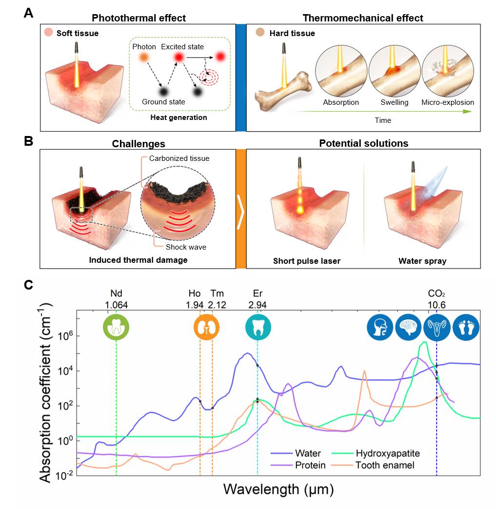 與(yu) 基於(yu) 機械加工的傳(chuan) 統手術工具不同,激光手術刀通過獨特的組織光學作用實現高效生物組織加工。文章詳細闡述了針對軟組織與(yu) 硬組織切除的光熱消融與(yu) 光致機械消融機理,並討論了水介導和超短脈衝(chong) 激光技術在緩解組織凝結、碳化等熱損傷(shang) 方麵的研究進展(圖1)。進一步地,文章分析了以Nd、Ho、Tm、Er和CO2激光為(wei) 主的紅外醫療光源在牙科、泌尿外科等多種手術領域的特點、優(you) 勢與(yu) 應用價(jia) 值,並強調新型手術激光光源技術的進步給激光傳(chuan) 輸介質在靈活性、穩定性和操控性等方麵帶來的巨大挑戰。