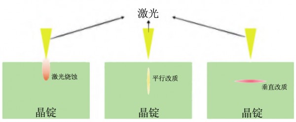 如圖3所示,常規的激光加工是利用燒蝕效應 或平行改質技術。這類技術是將材料沿激光入射方 向進行分離,僅(jin) 可用於(yu) 晶圓上的芯片分割。激光垂 直改質技術利用可穿透晶體(ti) 的一定波長的激光,通 過特殊設計的激光光學係統,在晶體(ti) 內(nei) 部極窄的深 度範圍內(nei) 實現高密度光吸收,從(cong) 而令晶體(ti) 材料發生 化學鍵斷裂與(yu) 分解、激光誘導電離、熱致開裂等一 係列物理化學過程。使用激光束在整個(ge) 晶體(ti) 表麵掃 描,即可形成垂直於(yu) 激光入射方向的改質層。