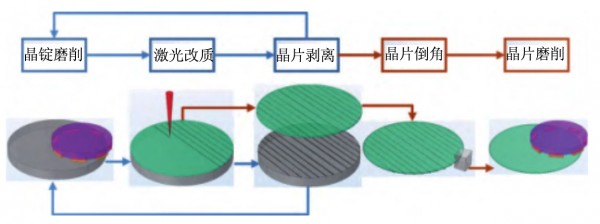 激光剝離技術可將晶錠加工成晶片,是多線切 割的替代技術。如圖4所示,用於(yu) 量產(chan) 的激光剝離 技術應包含激光改質、晶體(ti) 剝離、晶錠加工三個(ge) 工 藝步驟。首先在晶錠內(nei) 部指定深度使用激光掃描形 成一個(ge) 完整的改質麵,降低晶體(ti) 結合力;而後利用 機械拉伸、機械扭轉、超聲振動、冷卻的方式,使 晶體(ti) 在改質麵處斷裂,分割為(wei) 晶錠與(yu) 晶片;由於(yu) 剝 離後的晶錠表麵粗糙度較大,對激光的散射效應較 強,因此在下一層激光改質前需將晶錠表麵加工至較光滑的狀態。上述三個(ge) 步驟依次循環,即可將晶 錠連續加工成晶片。半導體(ti) 器件製造工藝需在原子 級平滑的表麵上進行外延薄膜生長,利用激光剝離 技術加工的晶片表麵粗糙度僅(jin) 可達到微米級,因此 需進一步通過磨拋加工,方可製成合格襯底片。