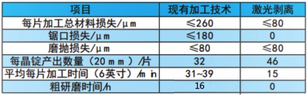 2)激光剝離技術幾乎無材料損耗,僅(jin) 需在後續磨拋工藝中將上下表麵共去除約80 μm的材料。而 多線切割工藝中會(hui) 造成與(yu) 切割線直徑接近厚度的材料損傷(shang) (按180 μm估算),後續磨拋工藝也需去 除約80 μm的粗糙起伏區與(yu) 損傷(shang) 層,因此使用激光 剝離技術SiC加工損耗可從(cong) 260 μm降低至80 μm。對於(yu) 20 mm厚的SiC晶錠,等量原料的情況下產(chan) 量提 升44%。