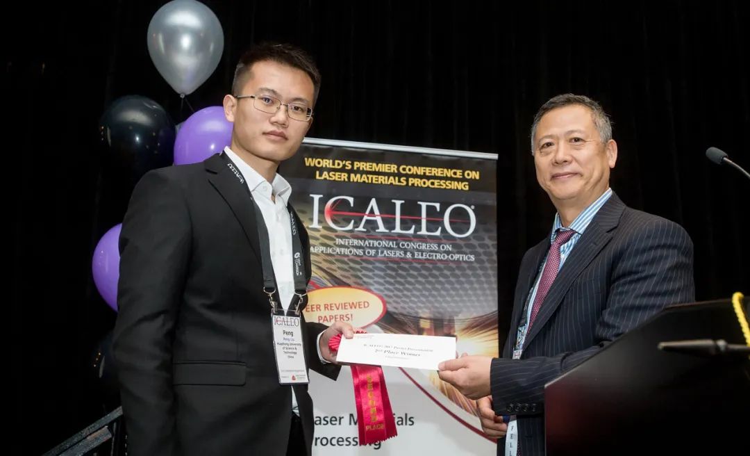 ▲劉朋(左)在激光和電子光學應用國際大會(hui) (ICALEO)現場