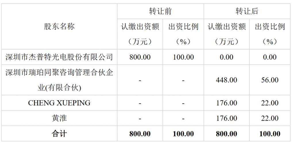 3 月 6 日,傑普特發布公告,該公司基於(yu) 戰略規劃需要,擬向深圳市瑞珀同聚谘詢管理合夥(huo) 企業(ye) (下稱 " 瑞珀同聚 ")、CHENGXUEPING、黃淮轉讓公司控股子公司深圳市瑞珀精工有限責任公司(下稱 " 瑞珀精工 ")100% 的股權,本次交易完成後,該公司不再持有瑞珀精工股權。