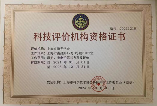 由上海市科學技術協會(hui) 科技評價(jia) 工作委員會(hui) 組織的科技評價(jia) 機構資格評審會(hui) 於(yu) 2023年12月29日在上海市科學會(hui) 堂進行,上海市激光學會(hui) 成功通過複審,2024年1月1日發布最新的科技評價(jia) 機構資格證書(shu) 。