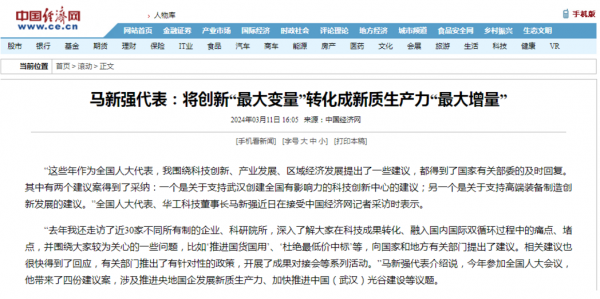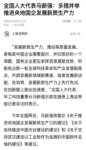 3月4日至11日,全國兩(liang) 會(hui) 在北京召開。十四屆全國人大二次會(hui) 議期間,全國人大代表,華工科技黨(dang) 委書(shu) 記、董事長馬新強提交了《關(guan) 於(yu) 加快推進中國(武漢)光穀建設的建議》、《關(guan) 於(yu) 推進央國企發展新質生產(chan) 力的建議》、《關(guan) 於(yu) 支持武漢建設以工業(ye) 軟件為(wei) 品牌的中國軟件名城的建議》等三項建議,涉及區域創新、新質生產(chan) 力等領域。