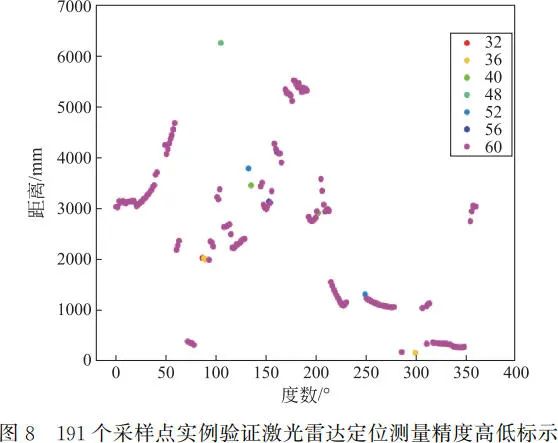 對該定位係統實例驗證,將定位測量係統置於(yu) 北林某教室的一個(ge) 桌麵上,對其周圍物體(ti) ——高於(yu) 桌麵的椅背 191 個(ge) 樣點進行定位(測量數據較為(wei) 龐大,略去)。MATLAB 繪製測量樣點(距離-角度-精度高低)分布圖,如圖 8 所示。圖中數字表示測量精度高低,數字由小到大表示測量精度由低到高。例如角度(Angle)為(wei) 104.4°時,樣點距離為(wei) 6258.5mm,精度數字標識 48。精度數字也就是激光雷達的強度,對於(yu) 每個(ge) 采樣點,就是激光雷達回波的強度,一定程度上反映被掃描點的反射率,這個(ge) 值越大,測量定位越好,精度越高。
