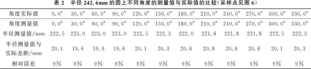 如圖 6 所示,選取標號為(wei) 1~12 的 12 個(ge) 相同半徑 r=242.6mm 的采樣點,即激光雷達與(yu) 12 個(ge) 不同采樣點的距離相同,都是 242.6 mm為(wei) 實際距離,進行距離和角度測量,計算測量值相對實際值的差距及相對誤差,測量數據結果如表 2 所示,角度結果保留小數點後 1 位的情況下,測量可以認為(wei) 準確,誤差可以被忽略,測量距離與(yu) 實際值之間的差距在 20mm 範圍擺動,測距相對誤差保留一位有效數字時為(wei) 9%,12 個(ge) 采樣點一致。結合不同距離,相同角度下測量值與(yu) 實際值的差距略大於(yu) 20mm(表 1),說明定位係統的誤差主要來源於(yu) 距離測量,方位角相對距離對定位結果的影響可以忽略不計。