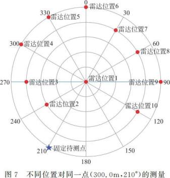 激光雷達位於(yu) 不同位置對同一點 M(300.0,210°)(距離單位 mm,角度單位度°)進行定位。M 點和激光雷達位置如圖 7 所示,雷達位置 1 為(wei) 定位係統的坐標原點,(ri,θi)為(wei) 激光雷達在位置 i 對固定點 M 的第 i 次測量時點 M 以激光雷達所處位置為(wei) 坐標原點時的極坐標,(rj,θj)為(wei) 激光雷達在位置 i 時,以 i 為(wei) 坐標原點對 M 點所測到的坐標值(ri,θi)平移為(wei) 已確定定位係統下的坐標值,即圖 7 中以雷達位置 1 為(wei) 定位坐標原點的坐標值。