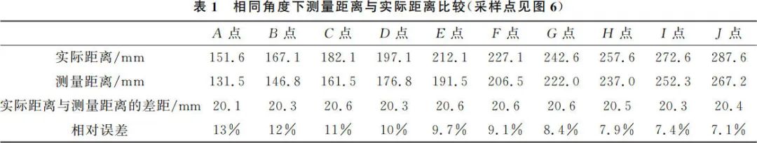 取一張繪圖紙,在繪製好的極坐標平麵上選取標號為(wei) A,B,C,D,E,F,G,H,I,G,K,L,I,J 共 10 個(ge) 點,它們(men) 的方位角均為(wei) 180.0°,如圖 5 所示。測量上述 10 個(ge) 點與(yu) 坐標原點即激光雷達的距離,對照為(wei) 平麵極坐標中以毫米尺所測距離為(wei) 實際距離,計算測量值相對實際值的誤差,測量結果如表 1 所示。