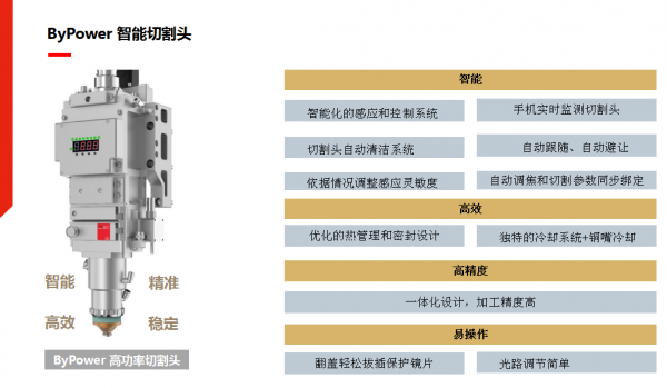 而ByPower切割頭堪稱智能、精準、高效、穩定的集大成者。它展現了高度智能化,擁有智能化的感應與(yu) 控製係統,可實時通過手機監測切割頭狀態,更配備了自動清潔係統、自動跟隨與(yu) 避讓功能,能根據具體(ti) 情境靈活調整感應靈敏度,實現自動調焦與(yu) 切割參數同步綁定,盡顯智慧之光。在高效性方麵,切割頭通過優(you) 化的熱管理與(yu) 密封設計,結合獨特的冷卻係統與(yu) 銅嘴冷卻技術,確保了卓越的工作效率。而在精準度上,其一體(ti) 化設計保證了加工精度之高超,令人歎為(wei) 觀止。此外,其操作簡便易行,翻蓋式設計使得保護鏡片的插拔變得輕鬆自如,光路調節亦是簡單直觀,讓使用者得心應手。
