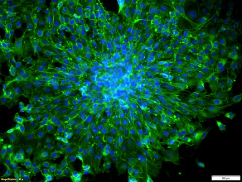 肌動蛋白染色的3T3成纖維細胞球體(ti) ,用於(yu) LIFT轉移,在激光製造的微孔中培養(yang) 。(Fraunhofer ILT供圖)。