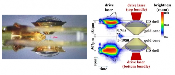 圖1 DCI實驗用靶和X射線條紋相機測得的時空分辨的對撞過程