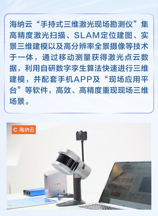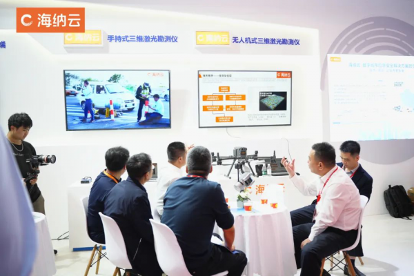 本次亮相“第十四屆交博會(hui) ”,海納雲(yun) 展示了自主研發的手持式與(yu) 無人機式三維激光現場勘測儀(yi) ,憑借高精度掃描、快速解算高效建模等性能,吸引眾(zhong) 多專(zhuan) 業(ye) 觀眾(zhong) 詳細了解和深入交流。