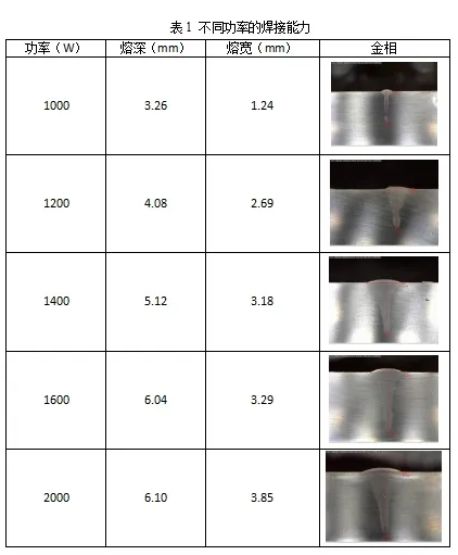 使用搭載銳科焊將係列RFL-C025H手持焊專(zhuan) 用激光器的激光設備,在不鏽鋼上進行堆焊。在其他工藝參數不變的情況下,改變激光器輸出功率,分別觀察焊接後的熔深熔寬。詳細數據如下表1所示。可以發現,隨著功率升高,焊接後的熔深越深,熔寬越寬。說明激光器的功率越高,手持焊設備的焊接能力越強。表1展示了不同功率激光的焊接能力。