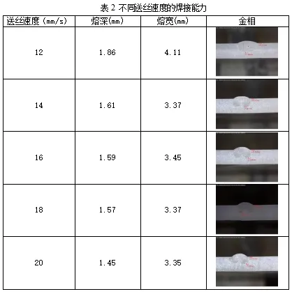 手持焊激光焊接一般采用的是激光填絲(si) 焊,會(hui) 配置送絲(si) 機作為(wei) 激光送絲(si) 設備,而送絲(si) 機的送絲(si) 速度也會(hui) 影響到設備的焊接能力。如下表2所示,為(wei) 功率1000W,焊接頭擺幅3mm,頻率50Hz參數時,不同送絲(si) 速度下在鋁合金上的焊接情況。可以發現,在其他參數不變的情況下,送絲(si) 速度越快,熔深越淺,焊接能力越差。