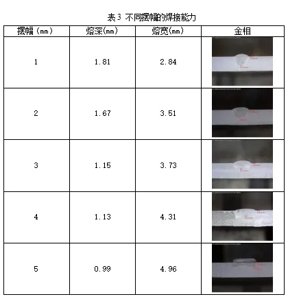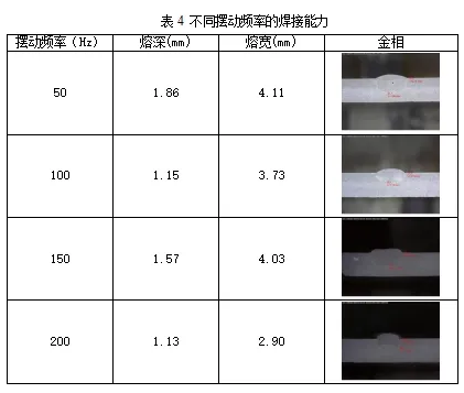 在搭載銳科焊將係列RFL-C015H1手持焊專(zhuan) 用激光器的激光設備上焊接鋁合金,分別控製單變量為(wei) 擺幅和擺動頻率,觀察焊接後的熔深和熔寬,分別如下表3、4所示。可以發現,隨著擺幅的增加,焊縫表麵的寬度明顯變大,但當擺幅為(wei) 4、5mm時,焊接頭的擺動速度會(hui) 達不到要求,焊縫表麵形貌表麵不連續;隨著頻率的增加,焊接熔深變低,但當頻率超過100Hz時,表麵形貌也變成不連續。