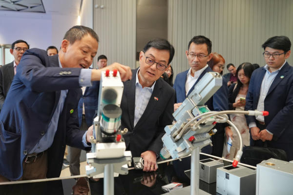 4月11日,新加坡副總理兼經濟政策統籌部長王瑞傑攜新加坡政府高級代表團蒞臨大族激光,大族激光董事長高雲峰總熱情接待並陪同參觀大族激光全球智造中心多功能新型展廳。高雲峰總向王瑞傑等一行人員介紹了大族激光發展曆程,重點參觀激光元器件、激光打標、激光焊接、激光切割、水晶內雕及金屬3D打印、數控、鋰電沙盤等,並在現場進行打標設備演示。王瑞傑充分肯定了大族激光科技創新優秀成果及智能製造強勁實力,雙方就企業之間進一步協同合作交換了意見,圍繞對外開放及發展新質生產力進行了更深入交流。
