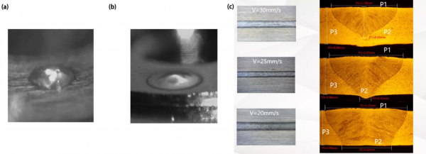 藍光激光在焊接不鏽鋼方麵也具有一定的優(you) 勢。由於(yu) 不鏽鋼對藍光的吸收率較高,藍光激光能夠有效地將能量轉化為(wei) 熱量,快速熔化不鏽鋼表麵,實現高質量的焊接。同時,藍光激光有較高能量密度和較小的熱影響區,有助於(yu) 減少熱變形和焊接區域的氧化,從(cong) 而提高焊接質量。圖6a為(wei) 3KW紅外激光融化不鏽鋼表麵,圖6b為(wei) 500W藍激光融化不鏽鋼表麵,融化過程可以看出,藍激光熔池更穩定,無金屬飛濺。