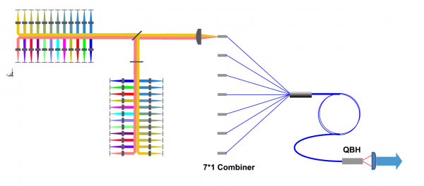 疊陣合束光源基於(yu) 微通道水冷疊陣,采用高功率厘米激光巴條,需先對光斑整形後才能合束,單層激光疊陣輸出功率可達50-75W,采用數十層疊陣合束,可實現數百瓦至上千瓦功率從(cong) 300~800μm光纖輸出,也可作為(wei) 直接光源應用。通過波長擴展,可將功率提升至更高。德國Laserline公司在該技術領域具有優(you) 勢,采用高亮度的激光bar, 通過棱鏡堆光束整形,推出了500到4KW激光器產(chan) 品。