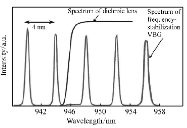 在光束質量一定條件下,為(wei) 提高合束激光功率及亮度,降低相鄰波長間隔增加合束單元數量是目前切實可行的方案, 它需從(cong) 兩(liang) 方麵同時考慮:一是改善半導體(ti) 激光器的光譜特性,減小譜寬、增強光譜穩定性,降低激光單元自身光譜不定性影響; 二是增加合束元件鍍膜曲線的陡度,減小合束元件透射波段和反射波段的波長間隔。