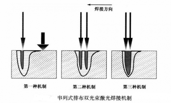 對於(yu) 串列式排布的雙光束激光焊接係統,根據前後兩(liang) 個(ge) 光束間距的不同,存在三種不同的焊接機製,如下圖所示。