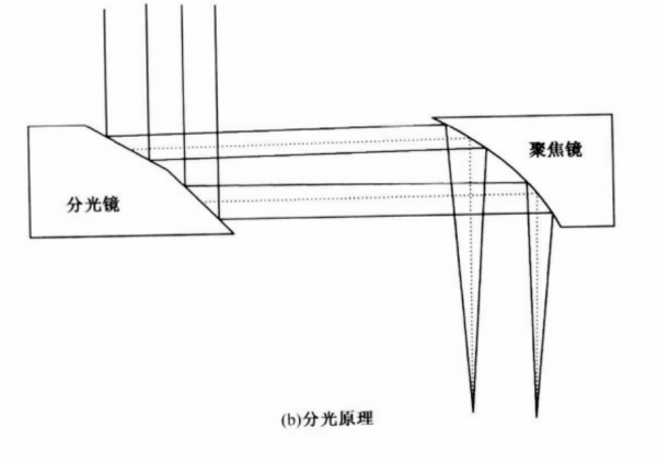 此外,也可以采用反射鏡作為(wei) 分光鏡,以光路中的最後一個(ge) 反射鏡作為(wei) 分光鏡。這種反射鏡也稱為(wei) 屋脊式反射鏡,其反射麵不是一個(ge) 平麵,而由兩(liang) 個(ge) 平麵組成,兩(liang) 反射麵的相交線位於(yu) 鏡麵中間,類似一個(ge) 屋脊,如圖所示。一束平行光照射在分光鏡上,被不同角度的兩(liang) 個(ge) 平麵反射形成兩(liang) 束光,照射到聚焦鏡的不同位置,聚焦後在工件表麵得到一定間距的兩(liang) 個(ge) 光束。通過改變兩(liang) 個(ge) 反射麵的夾角和屋脊位置,可以得到不同焦點間距和排布方式的分光光束。
