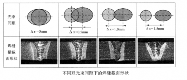 研究表明,焊接2mm厚的5000係列鋁合金時,兩(liang) 光束間距在0.6~1.0mm時,焊接過程較為(wei) 穩定,形成的匙孔開口較大,利於(yu) 焊接過程中鎂元素的蒸發、逸出。兩(liang) 束光的間距過小,類似單光束焊接過程不易穩定;間距過大,會(hui) 影響焊接熔深,如圖6-33所示。此外,兩(liang) 束光的能量配比對焊接質量也有較大影響,當間距為(wei) 0.9mm的兩(liang) 光束串行排布焊接時,適當增加前一個(ge) 光束的能量,使前後兩(liang) 個(ge) 光束的能量比大於(yu) 1:1,有利於(yu) 改善焊縫質量,增大熔化區域,在焊接速度較高時仍然可以得到光滑美觀焊縫。