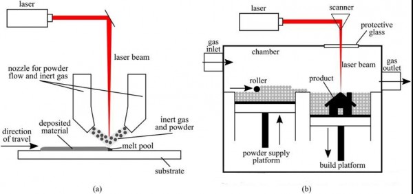 圖1.(a)DED技術示意圖;(b)LPBF技術示意圖