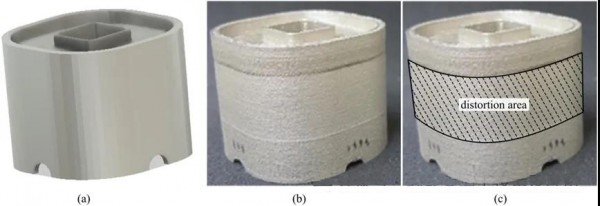 圖 2. 316 L不鏽鋼在LPBF工藝的變形產(chan) 品:(a)設計產(chan) 品的CAD模型;(b)打印樣品;(c)成品上的變形麵積