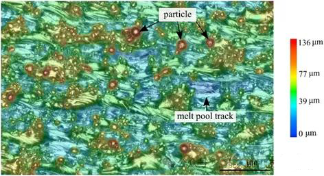 影響產(chan) 品幾何和尺寸精度的另一個(ge) 因素是表麵光潔度精度,也稱為(wei) 表麵粗糙度。在打印過程中,部分熔化的顆粒和飛濺物附著在產(chan) 品表麵,導致最終與(yu) 設計尺寸不同。表麵粗糙度不僅(jin) 會(hui) 影響產(chan) 品的使用,還會(hui) 影響材料的性能。圖3顯示了LPBF工藝製備的316 L不鏽鋼的典型形貌,可以觀察到熔池軌跡和附著的顆粒。
