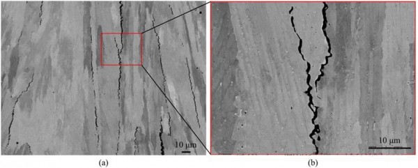 在LBAM製備工藝中,在高激光能量輸入下,金屬粉末快速熔化並快速凝固。熔池內(nei) 冷卻速率可達1.6×106 K/s以上。根據材料、工藝和零件設計,裂紋在凝固過程中和凝固後產(chan) 生。例如,在凝固的最後階段,由於(yu) 液體(ti) 供給不足而形成凝固開裂。應變時效裂紋是一種韌性裂紋,是由於(yu) 熱處理過程中析出相的形成而產(chan) 生的。在打印樣品中產(chan) 生大量的殘餘(yu) 應力,這些殘餘(yu) 應力可能超過材料的極限強度而導致形成裂紋。圖6為(wei) LPBF打印過程中,凝固裂紋沿晶界發展。