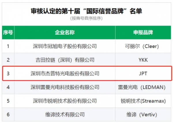 為(wei) 提升中國優(you) 秀品牌的國際影響力,持續推進品牌國際化,經第三方機構--聯合國工業(ye) 發展組織中國南南工業(ye) 合作中心對評選方式和公正性審核確認,深圳知名品牌評價(jia) 委員會(hui) 與(yu) 聯合國工業(ye) 發展組織認定並發布十屆“國際譽品牌”。經深圳知名品牌評價(jia) 委員會(hui) 全體(ti) 會(hui) 議審議審核認定深圳市傑普特光電股份有限公司“JPT”品牌為(wei) 第十屆“國際信譽品牌”,2024年5月9日召開“第八屆深圳(灣區)國際品牌周開幕大會(hui) ”,對“國際信譽品牌”進行頒獎。