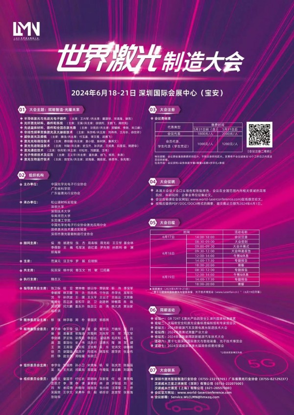 由中國光學光電子行業(ye) 協會(hui) 、廣東(dong) 省科學院、廣東(dong) 省激光行業(ye) 協會(hui) 聯合主辦的LMN 2024世界激光製造大會(hui) 將於(yu) 2024年6月18-19日在深圳國際會(hui) 展中心(寶安新館)拉開帷幕。以“賦能智造·光耀未來”為(wei) 主題,LMN世界激光製造大會(hui) 立足灣區,輻射全球,致力於(yu) 打造專(zhuan) 屬於(yu) 激光行業(ye) 人士的互聯平台。本屆大會(hui) 包括全體(ti) 大會(hui) 及精心策劃的10場分論壇,匯聚我國激光及相關(guan) 應用領域的頂尖專(zhuan) 家和學術領袖,他們(men) 將與(yu) 激光企業(ye) 代表和行業(ye) 應用端企業(ye) 代表一道,共同探討激光行業(ye) 的前沿問題和上下遊產(chan) 業(ye) 的發展現狀,預計吸引專(zhuan) 業(ye) 聽眾(zhong) 超千人。
