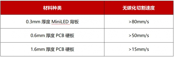 光至推出的40W高功率納秒紫外激光器實際出光功率可高達50W以上,擁有超過20%的功率冗餘(yu) ,出廠前更是會(hui) 經過長達7天滿功率烤機,以確保激光器能長期穩定工作。 三、光至科技固體(ti) 納秒紫外激光器加工應用展示 為(wei) 了滿足不同的應用需求,光至科技可提供5W-40W等不同規格的紫外激光器,來對不同規格和不同厚度的PCB進行打標,切割等應用。 (PCB標記、切割) 表1:不同材料的切割速度 四、光至科技與(yu) 客戶攜手共贏 光至科技,致力於(yu) 服務精密製造的先進光源供應商。除了紫外激光器外,光至科技還陸續推出了光纖MOPA、QCW、光纖紅外皮秒和綠光等係列工業(ye) 激光器產(chan) 品,同時可以根據客戶需求提供定製化解決(jue) 方案,滿足不同細分領域的個(ge) 性化需求。不僅(jin) 如此,光至科技目前已在深圳、蘇州和濟南設有銷售及打樣服務中心,為(wei) 大家提供免費的打樣服務! “光照萬(wan) 物、至誠致遠”。光至科技致力於(yu) 通過不懈的技術創新和產(chan) 品性能的持續提升,將激光器塑造成為(wei) 未來製造業(ye) 中的基礎性工具。以至誠之心,行致遠之路,與(yu) 您共同開拓更加廣闊的發展前景,書(shu) 寫(xie) 激光行業(ye) 的輝煌篇章!