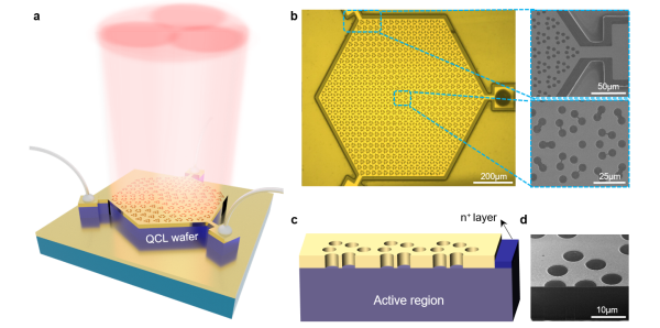 由於(yu) SMDC設計未破壞有源區且SMDC結構具有高麵輻射效率,該器件實現了150毫瓦的單模麵發射峰值功率。此外,該器件具有渦旋偏振遠場,通過引入相位調製,在保持拓撲激光器渦旋偏振特性的情況下,獲得了對稱性可調節的遠場。該器件是理想的片上渦旋偏振光源。