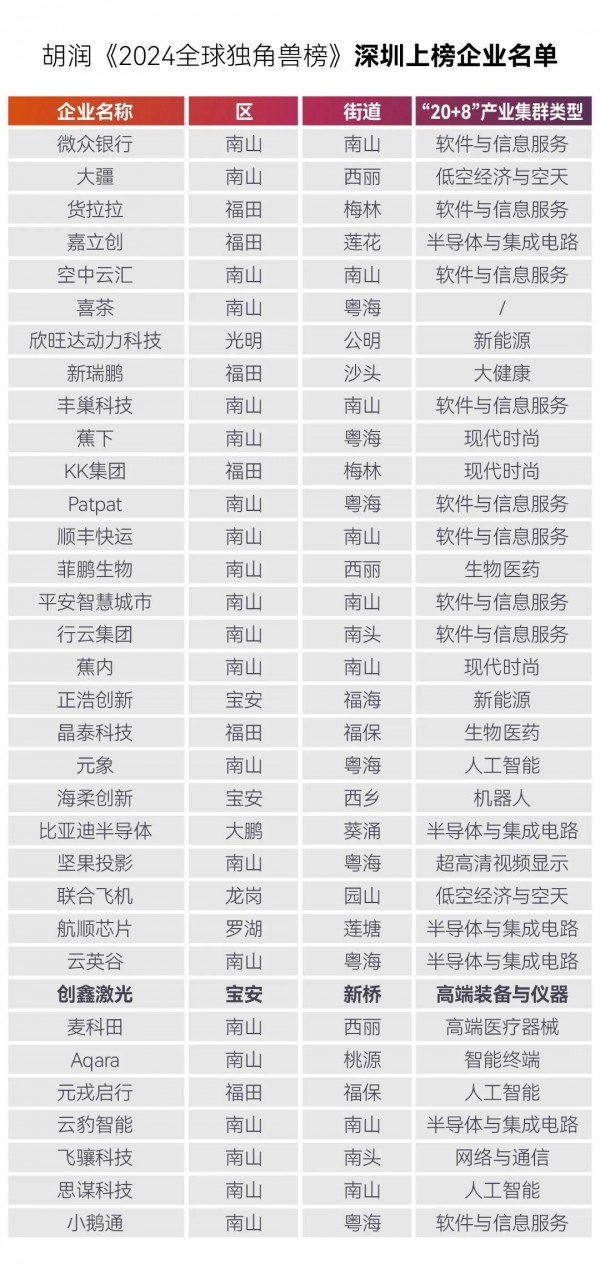 近日,胡潤研究院發布《2024全球獨角獸(shou) 榜》。榜單顯示,全球共有1453家企業(ye) 上榜。其中,中國有340家獨角獸(shou) ,居全球第二位,多為(wei) 智能製造、能源電力等“硬科技”企業(ye) 。深圳有34家企業(ye) 上榜,創鑫激光是激光行業(ye) 唯一一家入榜企業(ye) 。