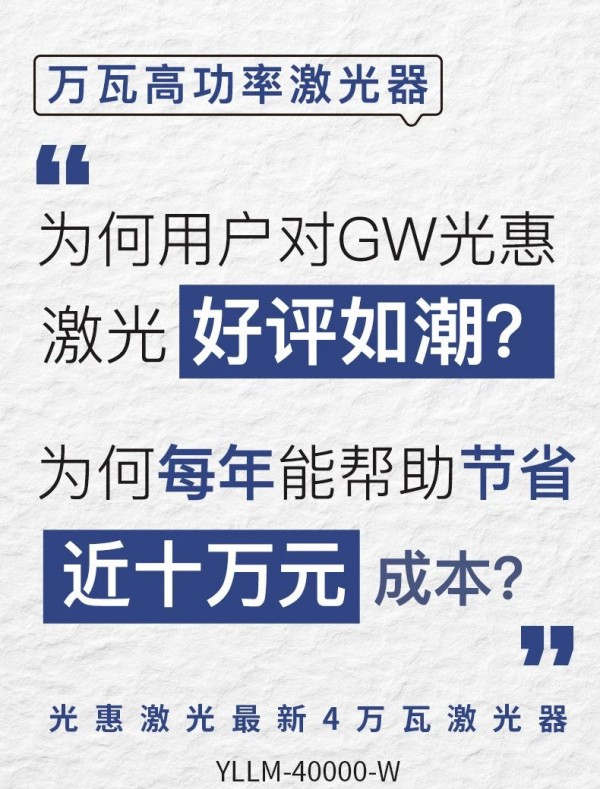 光惠激光YLLM-40000-W,在相同環境下運行,綜合可實現每年節省7萬(wan) 元以上。