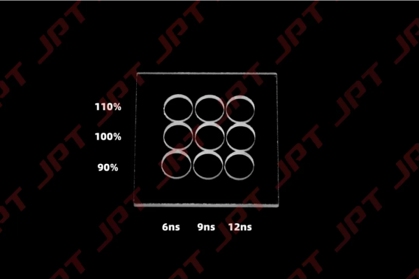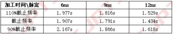 ①脈衝(chong) 寬度對玻璃鑽孔的影響 下麵是對超白玻璃進行鑽孔實驗,圓的孔徑大小為(wei) 10mm,厚度為(wei) 3mm,分別采用6ns模式,9ns模式,12ns模式對應的截止頻率測試脈寬對玻璃切割的影響。 圖1 不同脈寬和頻率切割的效果