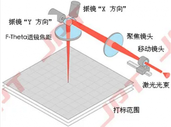 通過實驗可以得出結論,9ns的崩邊平均值和崩邊最大值控製得最好,隨後是6ns同樣有著不錯的崩邊表現,12ns的崩邊平均值和最大值略大,分析原因是12ns下熱量堆積造成崩邊。合適的單脈衝(chong) 能量和峰值功率對於(yu) 控製崩邊有著重要的影響,相同脈寬下更高的單脈衝(chong) 能量,更高的峰值功率有著更好的加工效果。 ②重複頻率對玻璃鑽孔的影響 通過實驗可以得出結論,重複頻率為(wei) 截止頻率時,加工效率最高,加工時間減小降低了熱量堆積,崩邊相比90%和110%最小,截止頻率以下時輸出平均功率低導致效率偏低,截止頻率以上時單脈衝(chong) 能量和峰值功率下降導致效率偏低。 ③功率對玻璃鑽孔的影響 激光器的功率影響著加工的效率和時間,為(wei) 了進一步探究激光器功率對效率的可觀影響,實驗采用同一參數僅(jin) 改變功率百分比的方式進行測試。參數選擇9ns 模式280k頻率,功率百分比設置為(wei) 70%,80%,90%,測試3mm厚白玻璃鑽10mm直徑孔的效率。 通過實驗可以得出結論,隨著平均功率的提高,激光峰值功率提高,相同厚度相同孔徑鑽孔所需時間減小。 02 激光異形鑽孔實驗 激光器輸出激光束,振鏡電機通過高速移動實現激光束的高速移動,再經過F-Theta透鏡聚焦到工作範圍,這種加工方式方便可控可調,為(wei) 設備的自動化加工、集成一體(ti) 化提供了一種具有競爭(zheng) 力的方案。 圖3 振鏡工作原理