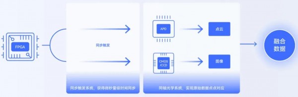 除此之外,探維科技針對多傳(chuan) 感器融合落地應用的難點,推出了硬件級圖像前融合技術產(chan) 品 Fusion。Fusion是把CMOS器件整合進了激光雷達係統,激光雷達與(yu) 攝像頭共用光源係統、共用硬件驅動,從(cong) 而實現天然點麵對應以及微秒兩(liang) 級同步,Fusion係統架構如圖4所示。