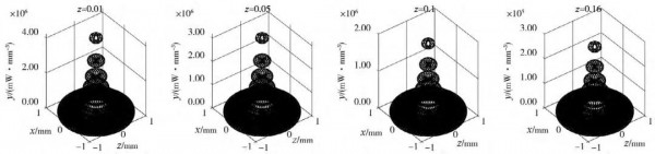 觀測以焊接中心為(wei) 圓心,半徑為(wei) 1mm的區域 內(nei) 相關(guan) 參數對麵熱源與(yu) 體(ti) 熱源熱通量分布情況的影響。圖2至圖4中,x、y坐標表示某時刻熔池表麵 某點距離焊接中心的坐標距離,z坐標表示該點的熱通量,例如:(0,0,1000)表示某時刻接中心的熱通量為(wei) 1000mW/mm3。圖5中,x,y坐標表示某時刻深度方向上熔池某截麵上某點距離焊接中心的坐標距離,z坐標表示該點的熱通量,例如:圖5中(0,0,1000)分別表示距離表麵 0.01mm, 0.05mm,0.1mm和0.16mm 的熔池截麵上,焊接中心的熱通量為(wei) 1000mW/mm3。