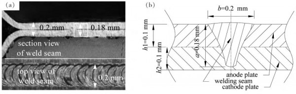 在雙極板的焊接過程中,需要精確控製熔池寬度和深度。熔池寬度決(jue) 定了熱影響區分布,越寬則熱影響區越大,熔池冷卻後殘餘(yu) 應力分布也越廣,由此而 產(chan) 生的殘餘(yu) 應力變形也越大。熔池深度決(jue) 定了焊縫 的密封性能和鍍膜性能,以兩(liang) 塊0.1mm 金屬板疊焊工藝為(wei) 例,熔池深度要控製約0.175mm。